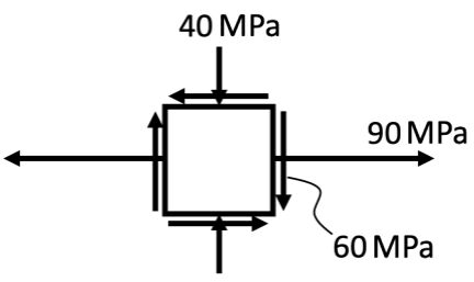 一、下圖為一元素受到靜態平面應力的狀況,該元素的降伏強度為 250 MPa、 極限拉伸強度為 350 MPa、耐久限為 170 MPa、蒲松比為 0.35,試求: