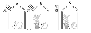 11074 如圖A、B、C三個完全密封的透明玻璃鐘罩,裡面都有充足的食物和水,A放入一隻老鼠;B放入一 盆植物與一隻老鼠,放置在有光的地方;C與B同樣裝置,但用黑布覆蓋保持無光狀態,假設三隻老鼠 的條件完全相同,試回答下列問題: