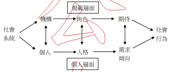 3.陳老師在學校服務三年後,想依據現行《教師進修研究等專業發展辦法》向學校申請全時進修碩士班一年。然而,陳老師兼任教學組長工作績效深獲學校肯定,學校希望他能暫緩進修,繼續兼任行政工作,陳老師的抉擇因此面臨兩難。依據蓋佐(J. Getzels) 和顧巴(E. Guba) (1957)所提出之社會系統理論(如下圖),回答下列問題: