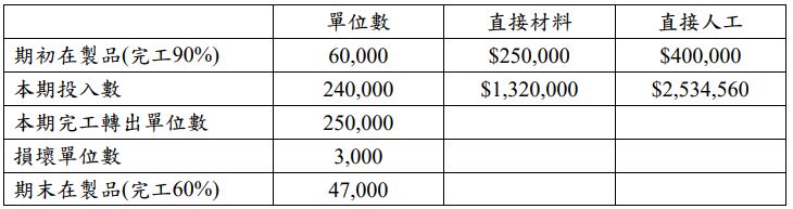 四、三亞公司之生產成本採用先進先出分步成本制度,直接材料系於生產伊始即全數投入, 直接人工及製造費用則於製程中平均投入,其中製造費用係依直接人工成本之60%分配 至產品成本中。公司品檢部門檢驗點設於製程進度之70%,依歷史經驗及公司管理標準,正常損壞單位設定為本期投入完好數量之1.5%,此時損壞品每單位殘值為$5。本期有關生產製造成本資訊如下:試問:(單位成本四捨五入取小數點後兩位,金額四捨五入取至元)