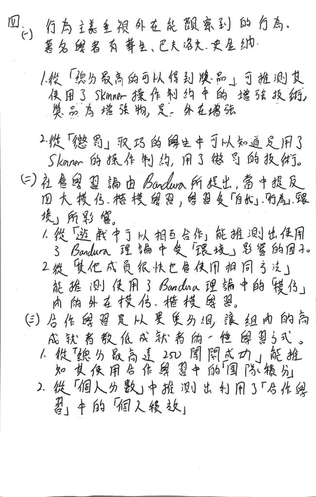 1.懲罰:採用嫌惡刺激的呈現或取消正增強(隔離)來抑制非預其行為。 符合元素:針對取巧的學生,為了防止這些學生利用相同的得分方法,也期待學生在面對問題時有自己的處理方式所採用策略。 2.正增強:凡是個體反應後,某一刺激物能使個體感到滿意、愉快或興奮,因而強化了該反應者,該刺激物即稱正增強物。 符合元素:總分最高的小組可獲得獎品,所以每個小組可能會因為增強物的關係,在參與活動時有更大的動機參與。