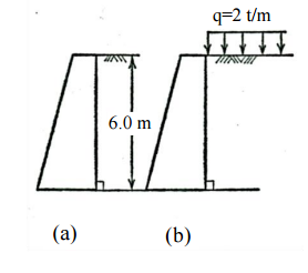 二、如圖(a)所示,背面垂直之擋土牆支承地表水平之回填砂土,此砂土之單位重為 1.65 t/m3,內摩擦角為 35°。