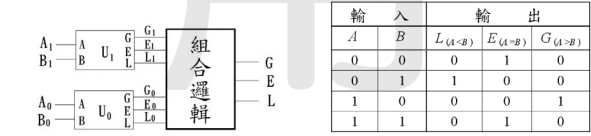 皆為 1 位元比較器,其真值表如下表所示;請寫出該組合邏輯電路的最簡輸出布林式。(註:只有 A