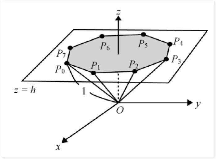 二、坐 標 空 間 中, O(0,0,0) 為 原 點。平 面z=h(其中0≤ h ≤1 )上 有 一 以(0,0,0) 為圓心 的 圓 , 在 此 圓 上 依 逆 時 鐘 順 序 取 8 點 構 成 正 八 邊 形P0P1P2P3P4P5P6P7,使得各線 段 的 長 度 都 是 1。 請 參 見 示 意 圖 。