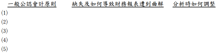 ⑴舉出五種在財務報表分析時,可能造成缺失之一般公認會計原則。
