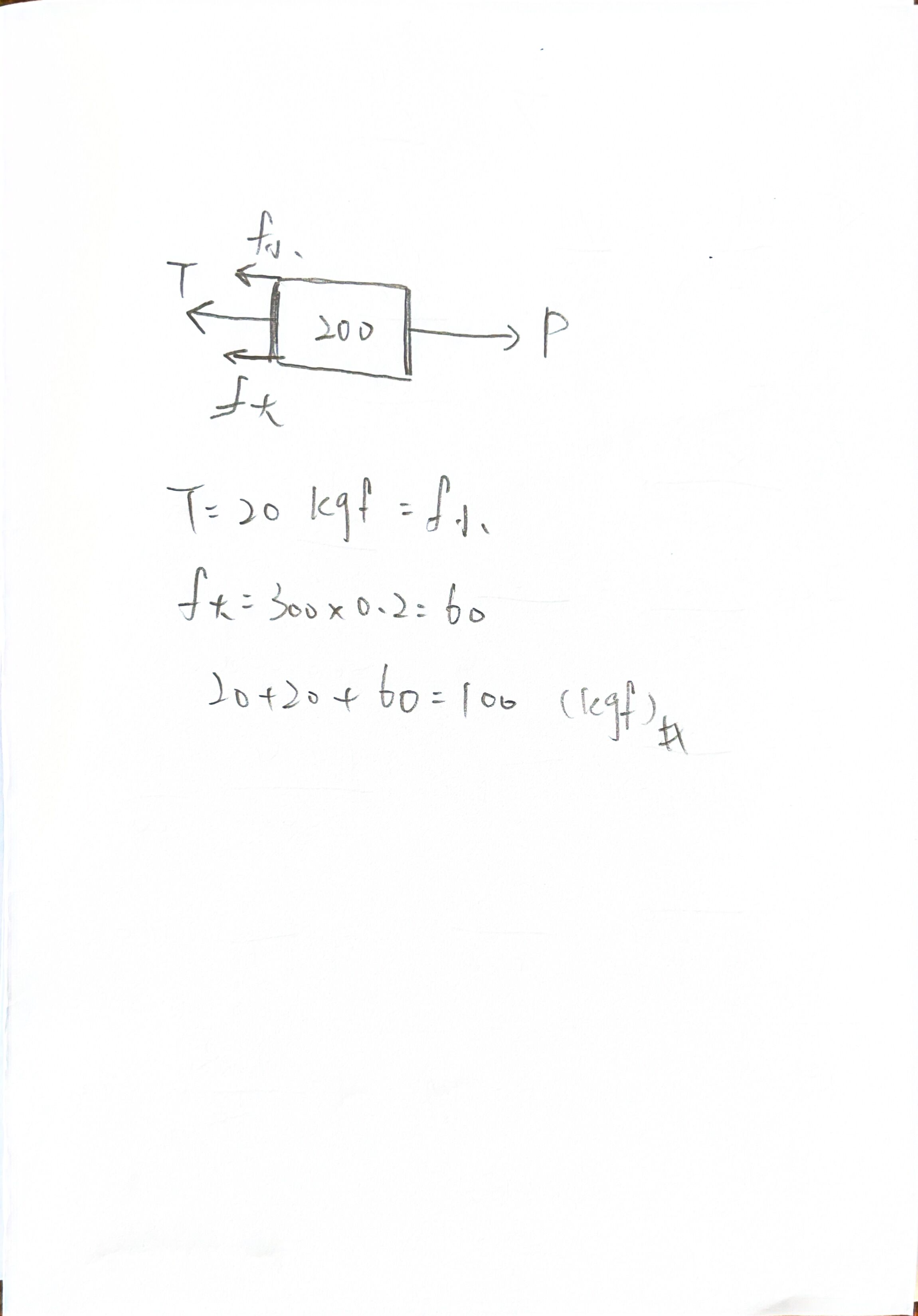 2.如右【圖6】所示,上下兩滑塊之重量分別為 100kgf、 200kgf,假設繩與滑輪間無摩擦,且繩與滑輪重量不計, 各平面間之摩擦係數均為0.2,且繩子之上下兩段均保持水平,若以一水平拉力P拉動此物體,恰可使物體產生 滑動,試求