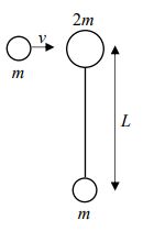 5.如圖所示,在光滑的水平桌面上,置有一長度為L,且質量可以忽略的細桿,質量為m和2m的質點固定在兩端,另一質量為m的質點沿垂直於細桿方向入射,以速度v撞擊2m的質點。若該入射的質點和被撞擊的質點在碰撞後合而為一,則碰撞後的瞬間,試回答下列問題:
