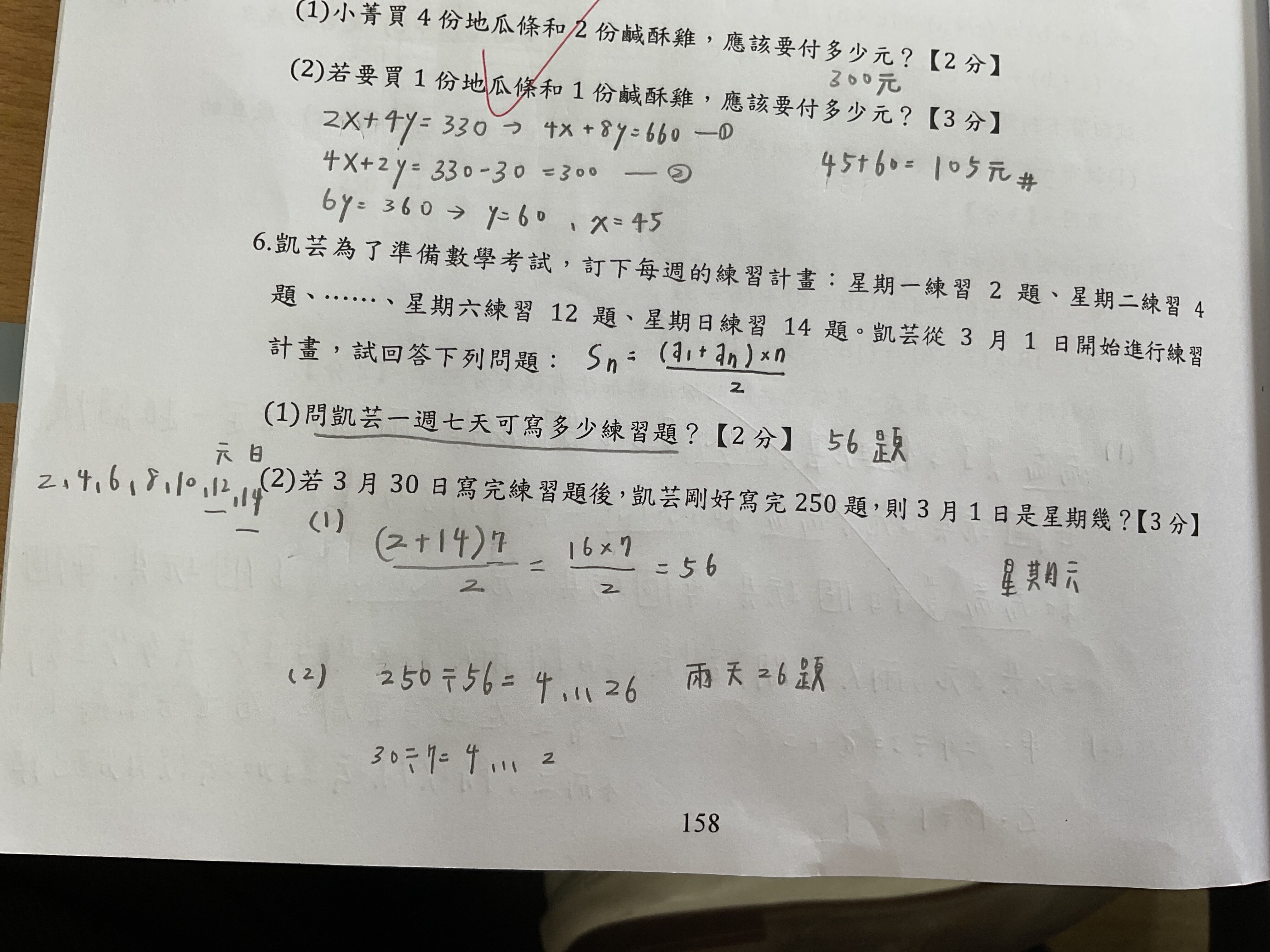 6.凱芸為了準備數學考試,訂下每週的練習計畫:星期一練習 2 題、星期二練習 4 題、……、星期六練習 12 題、星期日練習 14 題。凱芸從 3 月 1 日開始進行練習 計畫,試回答下列問題: