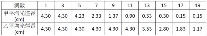 30. 小華做了豆漿廷得耳效應的探究實驗,做法如下:將甲、乙牌無糖豆漿分別滴入 40mL 的水中(以 50mL 的燒杯盛裝),以紅光雷射筆照射溶液(固定雷射筆位置離杯底 1 公分距離,緊貼著燒杯壁),觀察並記錄光徑長,以燒杯圓底直徑 4.30 公分為最大光徑長。重複三次實驗取平均,得到以下數據。試著作圖分析,並設計一題5個選項的多選題提問學生,需附上解答。