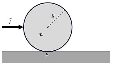 四、 有一質量均勻的剛體球質量為 m 半徑為 R,靜置於粗糙桌面上,在某一瞬間受一水平且過質心的衝量而開始運動,若球與桌面的動摩擦係數為μ,且重力加速度值為g。請回答以下問題:(已知轉軸過 球體質心的轉動慣量為)