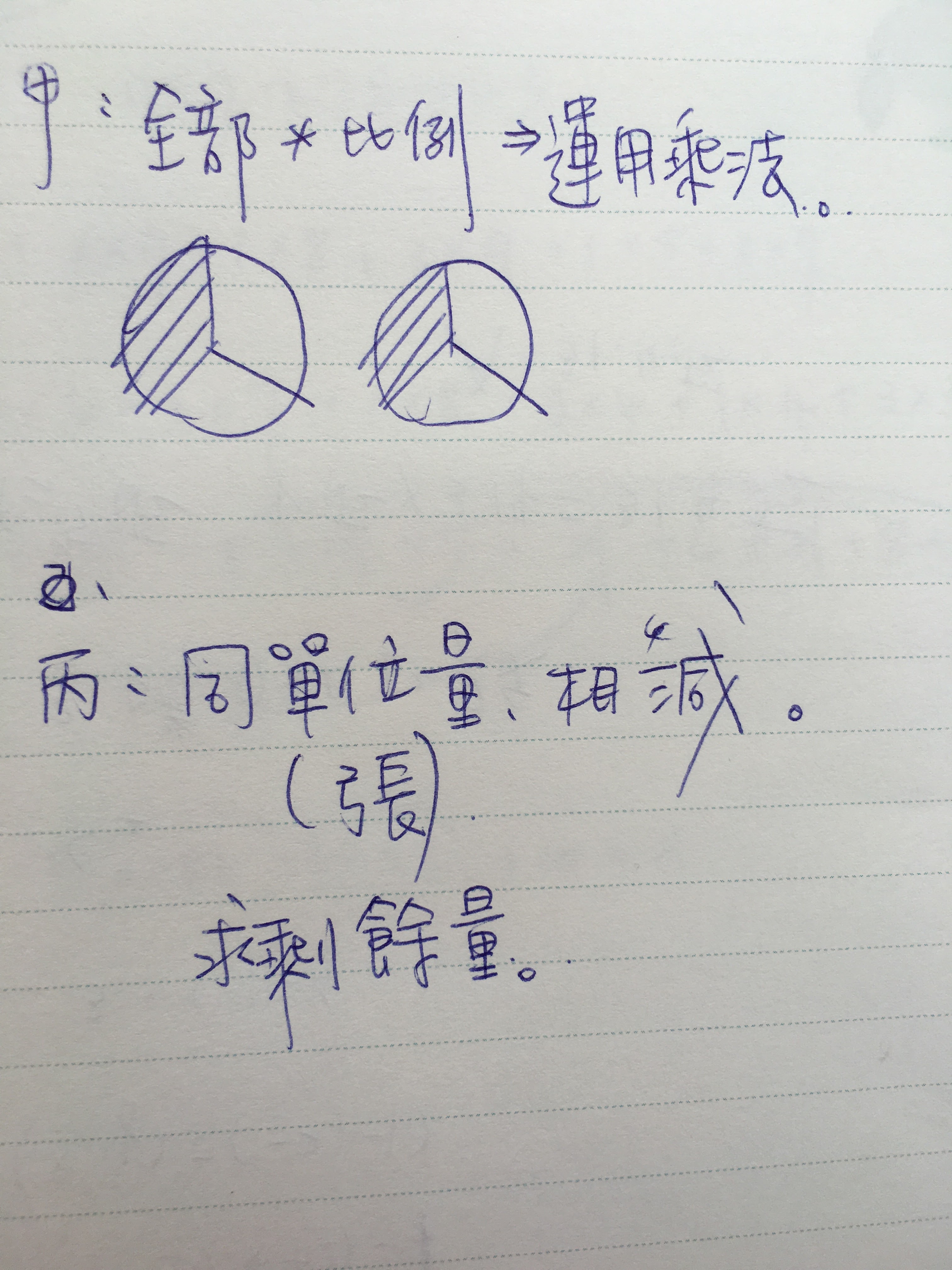 甲 要了解部分與整體的關係,且要知道全部的三分之一,意思是2張(整體)乘以三分之一(部分) 丙 單純的分數減法
