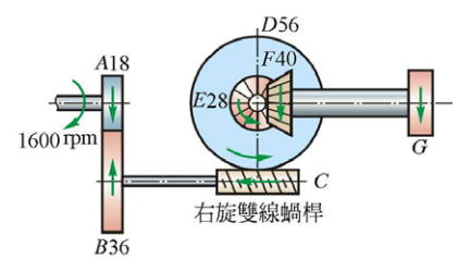 十、如下圖所示之複式輪系,A、B 為正齒輪,C 為右旋雙線蝸桿,D 為蝸輪,E、F 為斜齒輪,若 A 輪轉速為 1600 rpm,試求