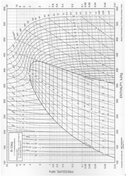 26. 某R-134a系統圖及各點溫度如下圖所示;(R-134a莫理爾線圖,如附錄三所示)