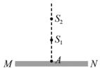 3. 湖面上有兩個完全相同的水波波源S1和S2,MN是足夠長的湖岸,S1和S2的連線與湖岸垂直,A點是兩波源連線與MN之交點,如圖所示。已知