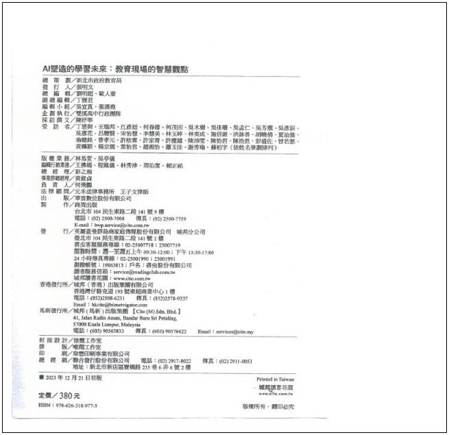 二、實作題實作題包括兩部分,第一部分請依據題目所列圖書選出該書的分類號(配分 5 分);第二部分請依提供之書名頁、版權頁與說明資料,以 MARC 21/CCR 輸入表單進行記述編目(配分 15 分)。若有需要新增欄號,請填入表單下方之空白列。1. AI 塑造的學習未來相關說明資料 ISBN 978-626-318-977-5 平裝 273 頁,高 21 公分 主題詞(lcstt):人工智慧,教學科技,數位學習 (參考用)