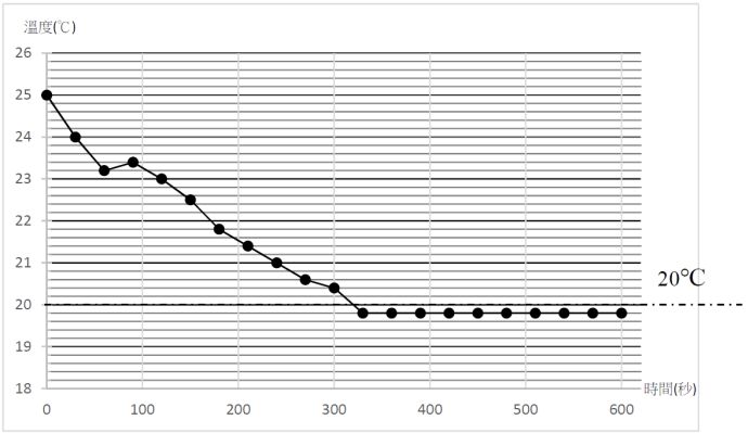 27. 下圖為硝酸鉀之溶解度實驗結果(溫度-時間)圖,學生取 2.02 g KNO₃ 溶解於 30 mL 水,以卡計測量溫度變化,從 25℃,每隔 30 秒記錄一次溫度。設水之密度恆為 1.0 g/mL、水溶液比熱為 4.20 J/g℃,卡計本身的熱吸收與實驗中之熱量散失皆可忽略;試回答下列問題:(KNO₃ = 101)