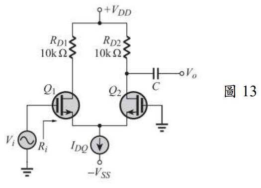 3. 如圖 13 所示 MOSFET 串級放大電路,若 \(Q_1=Q_2\),\(I_{DQ}=6 mA\),\(k=3\frac{mA}{V^2}\),試求