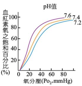 8. 血液的 pH 值從 pH7.4 降至 pH7.2 時,血紅素的 O