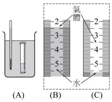 2. 1 升的燒杯裝滿水,將 10 毫升量筒倒扣入水中,如附圖 A 所示。 冷卻至 7°C 量記量筒上端空氣體積,如圖 B。 加熱至 82°C 再量記量筒中氣體體積,如圖 C。 當日大氣壓力 1.0 atm,若 7°C 的水蒸氣壓力很小可忽略不計: