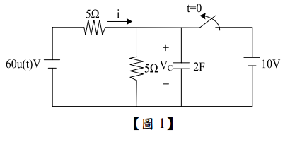 一、有一電路之開關原為閉合狀態,並呈現穩態。當 t=0 時,開關打開,如【圖 1】。請求解 下列問題:(各小題 5 分,共 15 分)