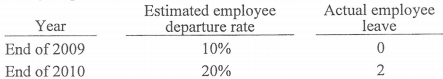 四、On January 1,2009,Across Company grants the company’s 10 employees options to purchase 103000 shares each of company’s $10 par value common stock. Each grant is conditional upon the employee working for the company over the next two years. Vesting occurs if the employee stays with the company for a two-year period. Once vested, the employee may exercise the options within the next one year. The option exercise price per share is $60,and the market price of the stock at the date of grant is $68 per share. The Company computes the fair value of the option by applying an option-pricing model to be $28 per option. The estimated employee departure rate and actual employee departures over the two-year period as follows: