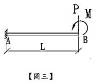 (3)如【圖三】所示之懸臂梁,自由端施加一集中載重P及彎矩M,若使用重疊原理,B點撓度為何?