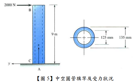 四: 有一 9 m 長的中空圓管旗竿,其基部固定於地上,另一端承受 2000 N 的力,該管的內 徑與外徑分別為 125 mm 及 135mm,如【圖 5】。