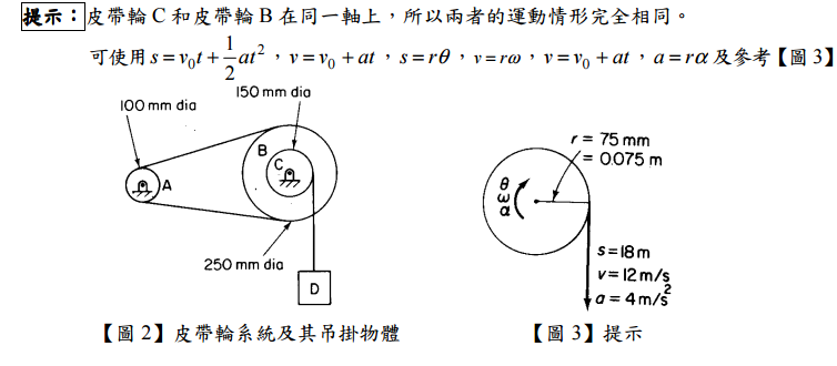 二: 有一物體重量為 D,掛在皮帶輪 C (pulley C)上,如【圖 2】所示。皮帶輪 A, B, C 的直 徑分別為 100 mm, 250 mm 及 150 mm。自靜止開始,重物 D 於三秒內向下墜落 18 m,