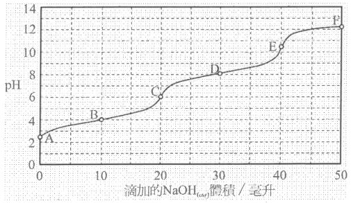 2. 25℃時用0.20M的NaOH(aq)滴定20.0毫升的二元酸H₂A(aq),所得的滴定曲線如下圖(pH隨滴加NaOH體積/毫升變化),試回答下列問題:(log2=0.3,log3=0.48)