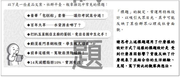 二、 下方題目為 113 年國中教育會考寫作測驗試題,題目問及圖中各種標題的「設計方式」、「影響原因」、「反映現象」以及要求寫下個人觀感。請於閱讀後,回答下列問題: