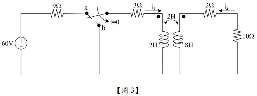 三、有一含互感之電路如【圖3】,開關已停在位置a 很久。當t=0 時,開關瞬間切換至位置 b,請求解下列問題: