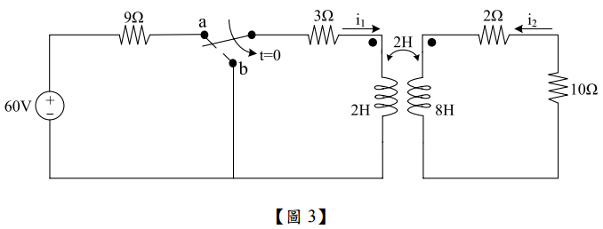 三、有一含互感之電路如【圖 3】,開關已停在位置 a 很久。當 t=0 時,開關瞬間切換至位置 b,請求解下列問題: