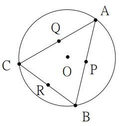 1. 如圖,公園管理處在一圓形草皮上蓋三條直線步道 AB、AC 與 BC 方便民眾觀賞花卉,其中 A、B 與 C 三處出入口皆在圓上,已知 A(6,7),圓心 O(2,4),O 點到直線 AB 與 AC 的距離皆為 \( \sqrt{5} \),並在三步道 \( \overline{AB}、\overline{AC}、\overline{BC} \) 的中點處 P、Q、R 三處設立路燈。試問:
