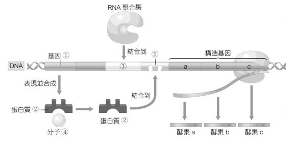 4. 本題引用自某年的指考考題,請針對本題的命題,並對照高中課綱分析試題優劣點。(7分) 分子F是細菌生長必須的養分,缺乏F分子時,細菌無法正常生長。細菌從環境中吸收A 分子後,利用a、b、c、d及e五種酵素催化一連串的代謝反應(反應式)。五種酵素中 的三種酵素基因a、b、c位於相同的操縱組(如附圖),此操縱組受到細菌體內F分子濃 度的回饋抑制。請根據上文陳述,回答(1)~(4)題。 反應式: