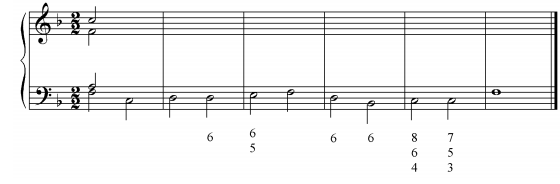 一、和聲題:以下列數字低音,完成混聲四部和聲,並標示調性及和弦級數代號。20%