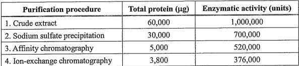 1. A scientist uses the yeast expression system to over-express one recombinant protein, and which is also an enzyme. Based on the enzymatic activity of the recombinant protein, the scientist is able to purify the protein and makes the purification table.