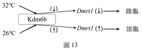 進一步的研究發現, Kdm6b 基因會影響 Dmrt1基因的表現與否,即 Kdm6b 蛋白質 的量相對較高時,會促進 Dmrt1基因表現 RNA,進而產生更多的 Dmrt1 蛋白質。 在 26 ℃時 , Kdm6b 蛋白質的表現量相對較高,於是活化 Dmrt1基因。在 32 ℃時 , Kdm6b 蛋白質的表現量相對低,使得 Dmrt1基因幾乎不表現。