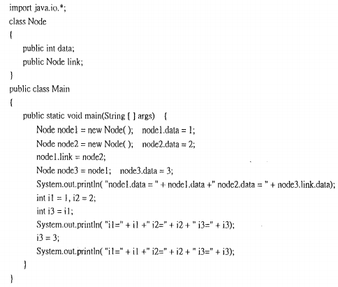 (b)請以此程式說明編譯器在記憶體管理方面對物件(object)與原始資料型態變數(primitive data type variable)之不同處理方式。(8分)