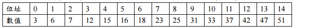 四、有一個經過排序(sorted)的陣列,位址及儲放的資料表示如下:(15 分)