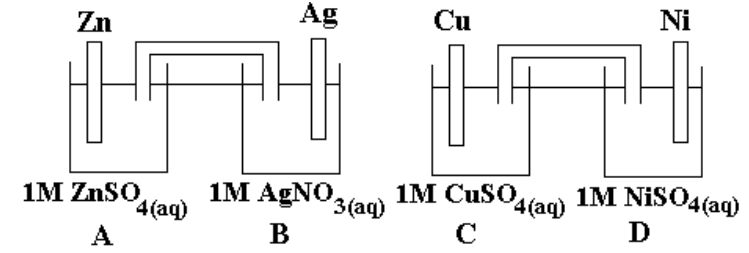 1. 於 25°C 下,有四個半電池 A-D,其中 A 與 B、C 與 D 分別以裝滿 1.0M KNO3 溶液的鹽橋聯接。各半電池的標準還原電位如下:
