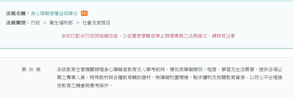 各級教育主管機關辦理身心障礙者教育及入學考試時,應依其障礙類別、程度、學習及生活需要,提供各項必需之專業人員、特殊教材與各種教育輔助器材、無障礙校園環境、點字讀物及相關教育資源,以符公平合理接受教育之機會與應考條件。