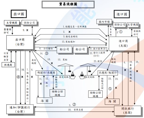 請依下列之貿易流程圖,依序將①②③④⑤之步驟名稱填入答案紙之答案欄內。 (本測試項目評分依公佈範例為準)