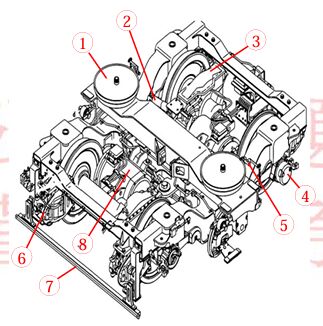 二、下圖為列車之轉向架圖示,其裝載①空氣彈簧(次懸吊)、②橫向阻尼器、③齒輪箱、④速度偵測器(速度感測器)、⑤水平閥、⑥碟式煞車總成、⑦障礙物偵測裝置及⑧牽引馬達,請簡述各設備之功能。