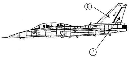 六、對飛機有興趣者,應該對飛機之各氣動力貢獻部分有所了解。某線傳控制之戰機其上視圖以及側視圖如下所示,請說明標示阿拉伯數字部分之名稱並說明其於空氣動力上之功能為何?(除第①、④及⑤小題4分外,其餘每小題2分,共20分,其中專有名詞可以原文作答,但拼字錯誤會扣分。)