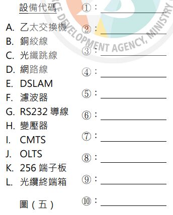 三、 某一光化交接箱(FTTC)後方三條巷子共接 69 戶 VDSL 如圖(三)所示。 每一 IP VSLAM 有 24 埠,光化交接箱內設備及元件配置架構如圖(四)所示,設備代碼如圖(五),請在空格內填入正 確的設備代碼