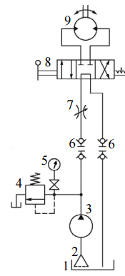 ⑴下圖所示之油壓迴路圖,編號 3、4、7、8 與 9 五個符號所代表之油壓元件名稱 分別為何?(5 分)