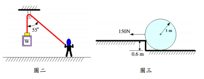 ⑴如圖二所示,一位作業人員利用滑輪以繩索提升一個重物 W,假設摩擦力忽略不 計,請繪出滑輪之自由體圖。(10 分)
