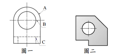 ⑴機械元件的製圖必須以適當的線條表示視圖,試說明圖一中,線條 A,B 及 C 的 名稱,並分別說明其用途。(5 分)
