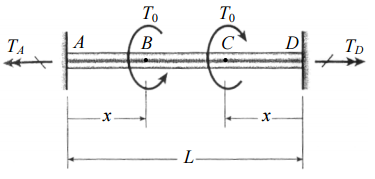 四、一圓桿ABCD兩端A、D為固定端(fixed end),B點及C點距離兩端為x(x<L/2),在B