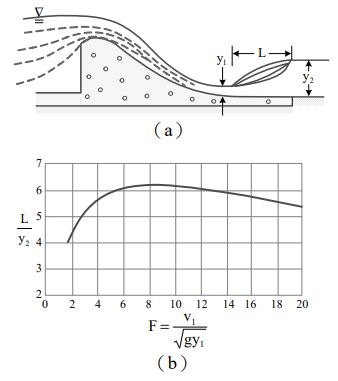 二、有一緊急溢洪道,如圖(a)所示。在設計護坦時須考慮水躍的長度 L, 而 L 與 y